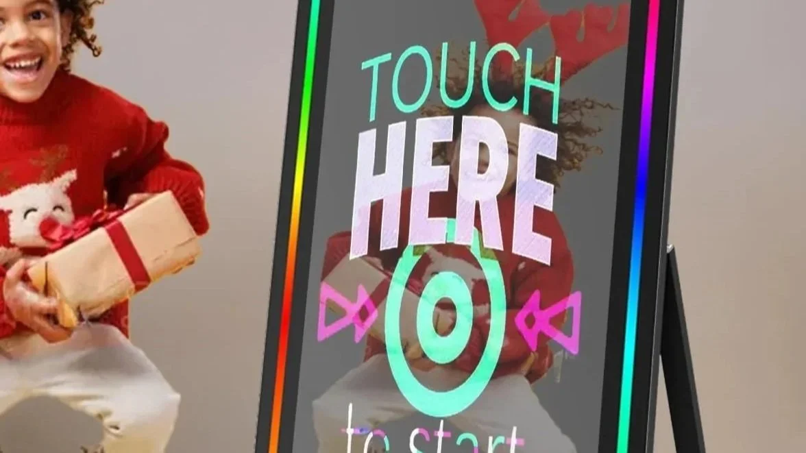Mirror-style units look like sleek full-length mirrors until someone taps them and triggers animations, prompts, or countdowns. They fit nicely along a wall or in a 10x10 corner and pull double duty at trade shows and corporate events.